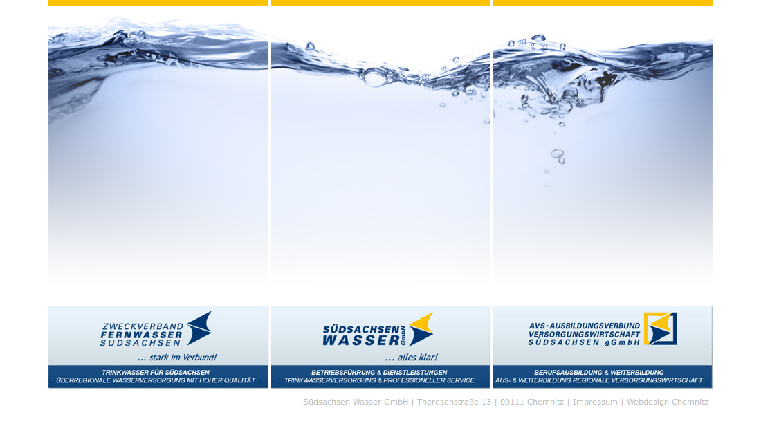 Erstellung von drei neuen Websites für die Südsachsen Wasser GmbH aus Chemnitz. Auf dem Bild sehen Sie das Webdesign der Startseite mit der Auswahlmöglichkeit zu den einzelnen Unterseiten. Die Südsachsen Wasser GmbH betreibt als kommunales Dienstleistungsunternehmen u. a. Wasserwerke und Wasserverteilungssysteme in Südsachsen.
