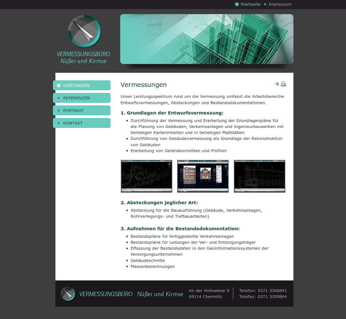 Erstellung einer neuen Website für Nüßer und Kirmse Vermessungen Chemnitz. Das Chemnitzer Vermessungsbüro führt Vermessungen, Absteckungen und Bestandsdokumentationen bereits seit 1994 durch. Das Webdesign wurde in Anlehnung an das Erscheinungsbild des Unternehmens erstellt und optisch „aufgepeppt“. Die Website wird vom Unternehmen mit dem simpilio®-Redaktionssystem selbst gepflegt.